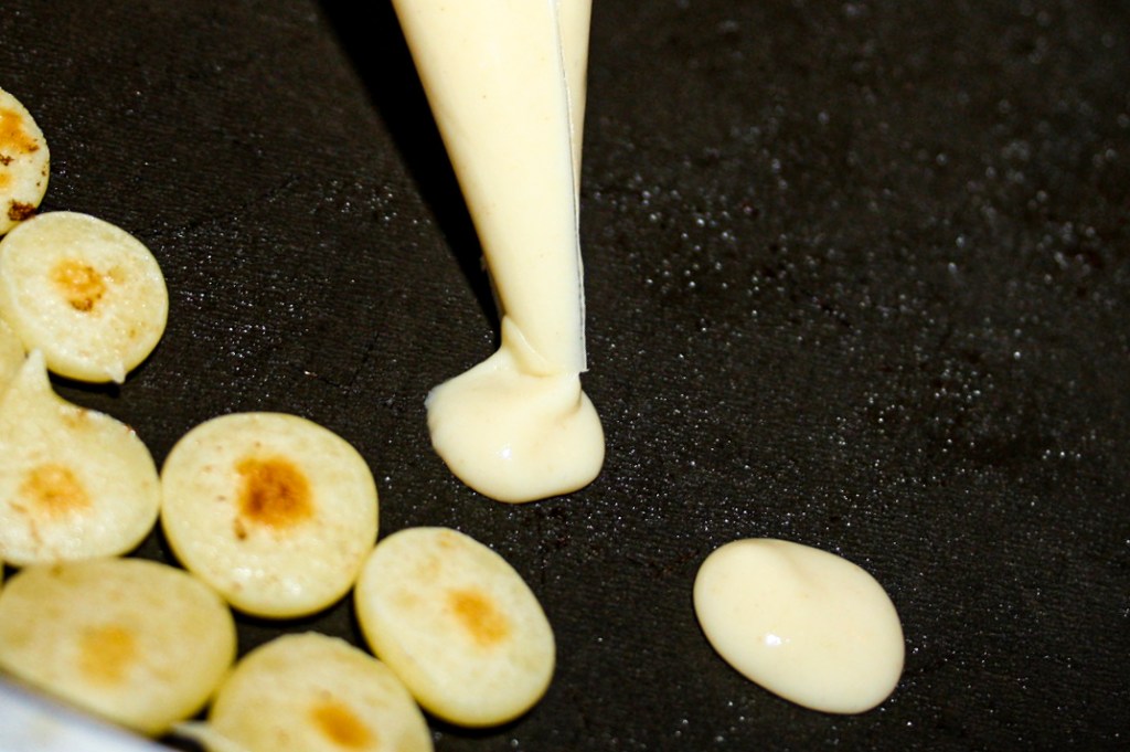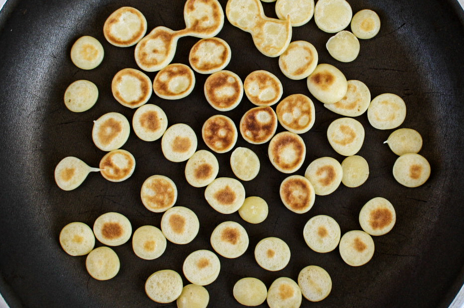 Ύστερα πιέζεις να βγούνε μεγάλες σταγόνες ζύμης επάνω στο τηγάνι. Υπολόγισε περίπου 1 με 2 εκατοστά να βγει το τελικό αποτέλεσμα κάθε σταγόνας. Μόλις δεις γύρω γύρω να σκληραίνει, γύρισε το να ψηθεί από την ανάποδη πλευρά. Λόγω μικρής ποσότητας θα πάρει ελάχιστα λεπτά για να ψηθεί, οπότε έχε τον νου σου μην τα κάψεις!
