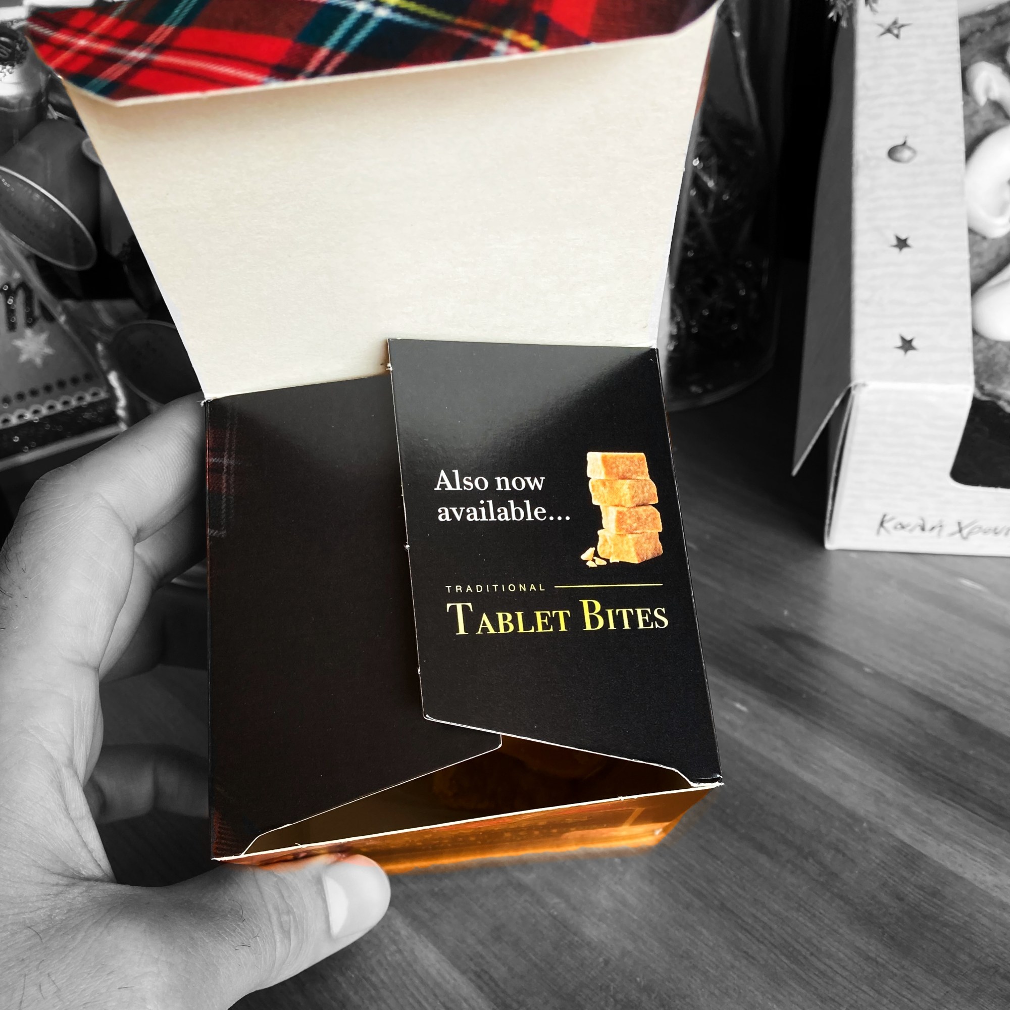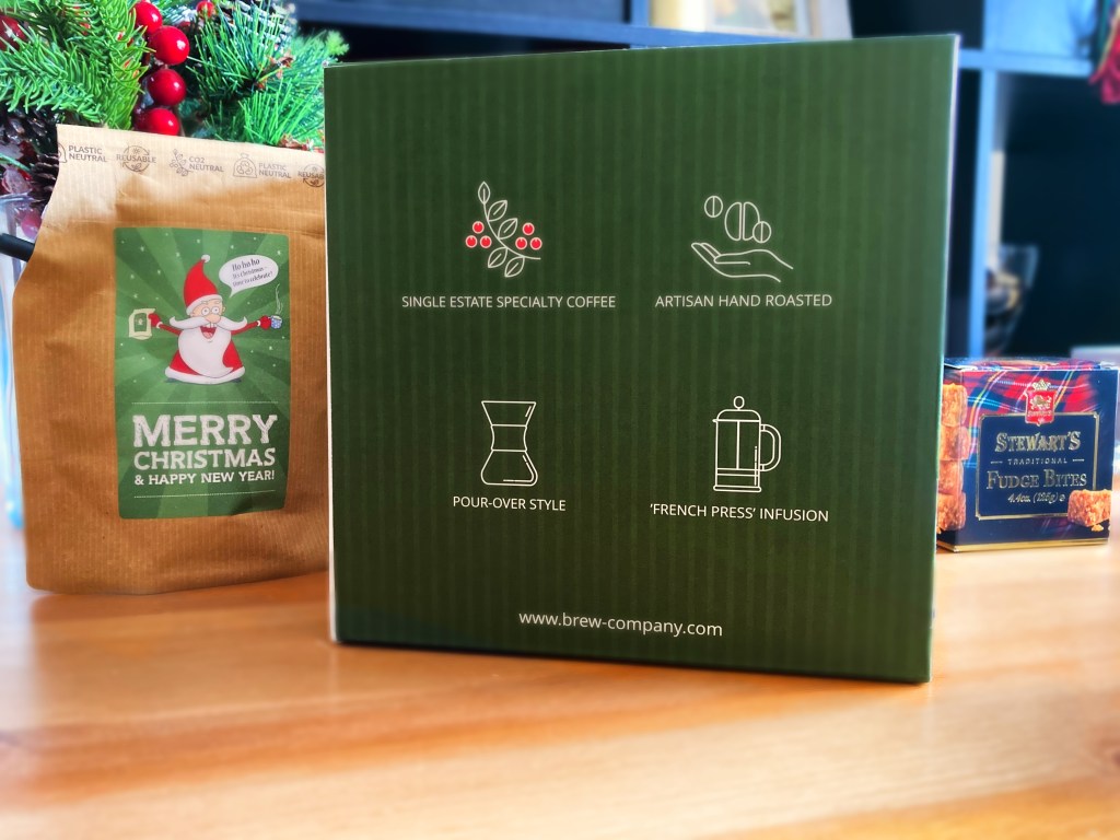 Ένα κουτί γεμάτο λιχουδιές από Σκωτία και φυσικά φρεσκοτριμμένο καφέ φίλτρου από όλο τον κόσμο σε μια μοναδική συσκευασία. Μια συσκευασία που μπορείς να την πάρεις μαζί σου και να την ξανά χρησιμοποιήσεις.